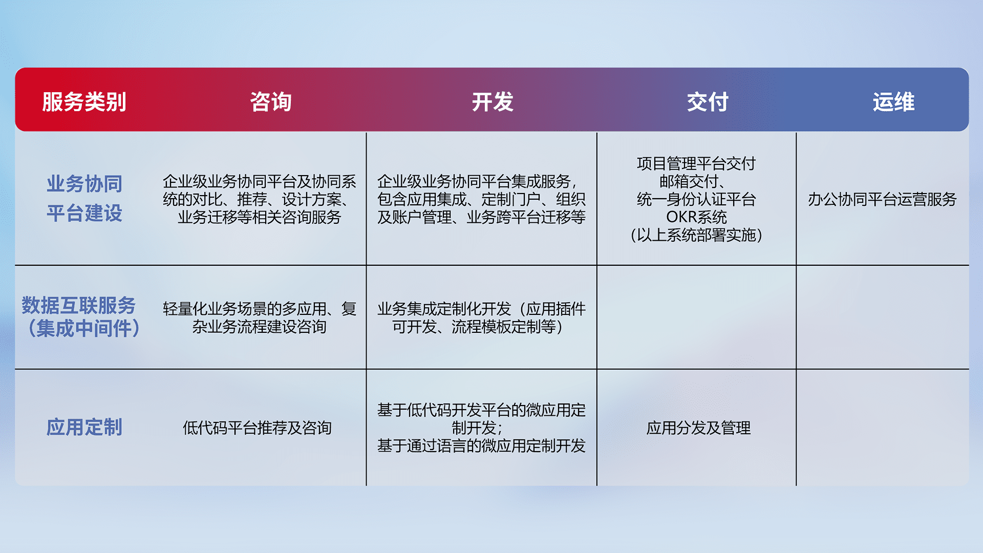 针对钉钉、、企微、、、IDaas等平台级产品提供产品的规划、、、、方案、、、交付、、、定制化开发等服务,,,实现如统一协同办公、、、、智能客户服务、、、混合会议管理、、智能数据查询、、等业务场景,,,,实现数字化转型。。。